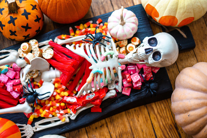 Grab your charcuterie board and pile on the treats. We used a fun plastic skeleton and plastic spiders paired with a colorful mix of candy from Kroger. Be sure to choose candy options for all ages; chewy or gummy candy is fine for older children and chocolate for the littles. Black charcuterie board available at FINE House & Garden or finehg.com.