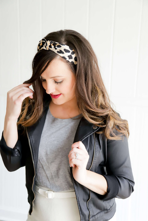 A black leather jacket is such a fun piece to have when you want to add an element of edge to any outfit. And adding a pop of leopard with a knotted headband is the cherry on top to a trendy look.