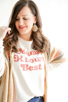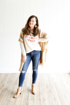 A graphic sweatshirt isn’t just for messy buns and yoga pants. This comfy (and relatable) sweatshirt pairs perfectly with a fringe poncho and leather earrings for a casual look on a chilly day. Plus it is multi-functional for a cozy day at home.